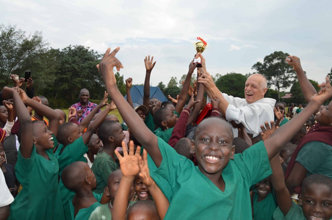 Fußball steht in Uganda hoch im Kurs. Pater Stanislaus freut sich mit den Siegern eines Fußballturniers.